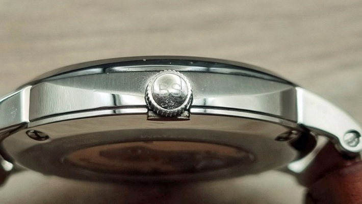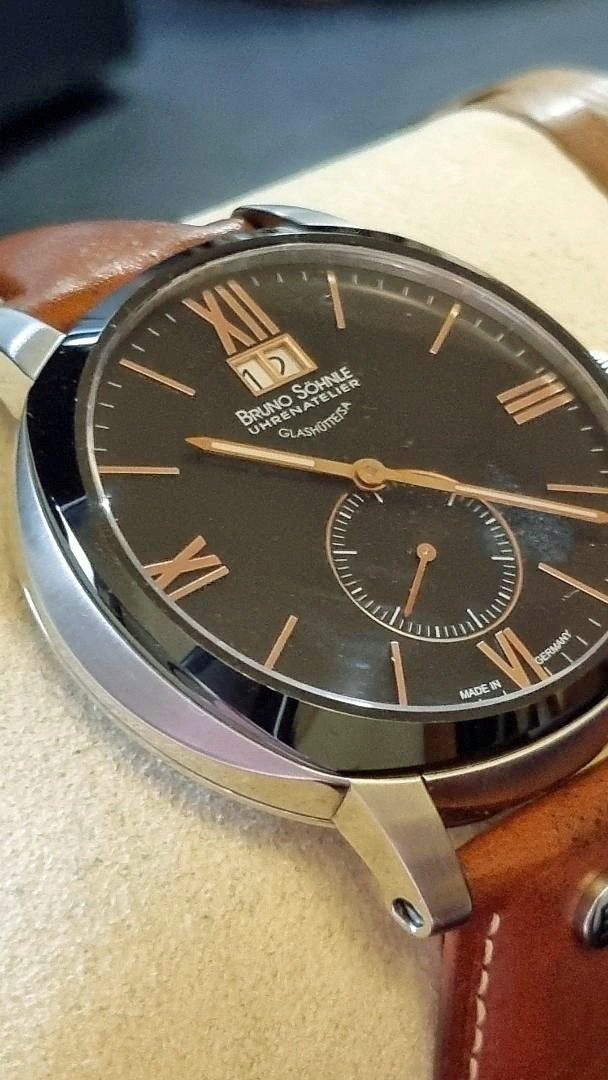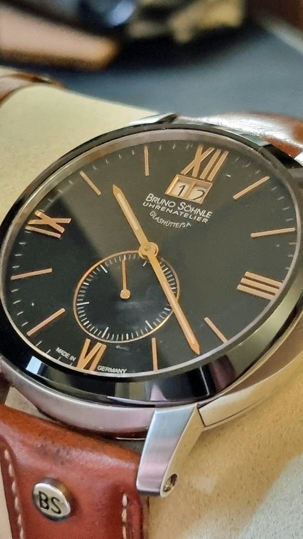 Diese Uhr ist ein optisches Highlight für mich. Grundsätzlich finde ich schwarze Zifferblätter sehr schön. Dazu kommen dann römische Stundenziffern auf der 3, 6, 9 und der 12. Die dazwischen liegenden Stunden sind mit kleinen Strichindizes gekennzeichnet. Diese Indizes und die römischen Ziffern, welche aufgesetzt aussehen begeistern mich jedes Mal aufs Neue.