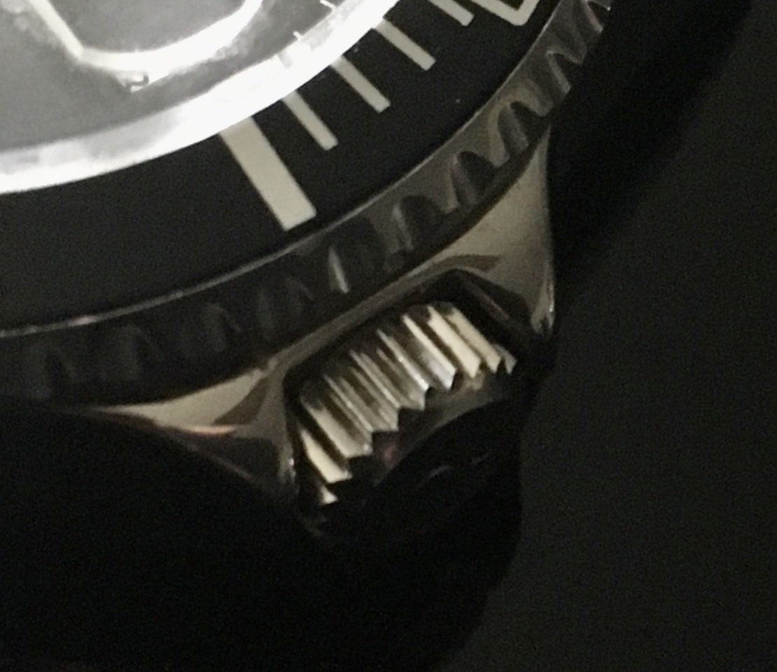 Typische Ausführung der Krone bei einer Taucheruhr. Die beiden seitlichen und gerundeten Metallvorsprünge neben der Krone verhindern eine Beschädigung durch Hängenbleiben oder Stoß.Bildquelle: Pittigrilli - Eigenes Werk