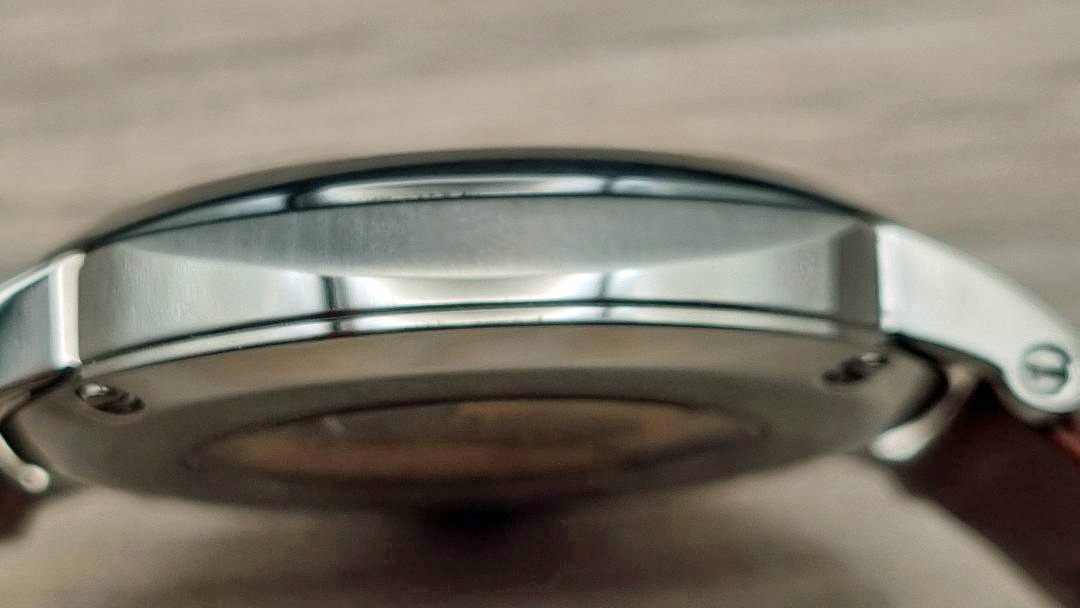 Diese Uhr ist ein optisches Highlight für mich. Grundsätzlich finde ich schwarze Zifferblätter sehr schön. Dazu kommen dann römische Stundenziffern auf der 3, 6, 9 und der 12. Die dazwischen liegenden Stunden sind mit kleinen Strichindizes gekennzeichnet. Diese Indizes und die römischen Ziffern, welche aufgesetzt aussehen begeistern mich jedes Mal aufs Neue.