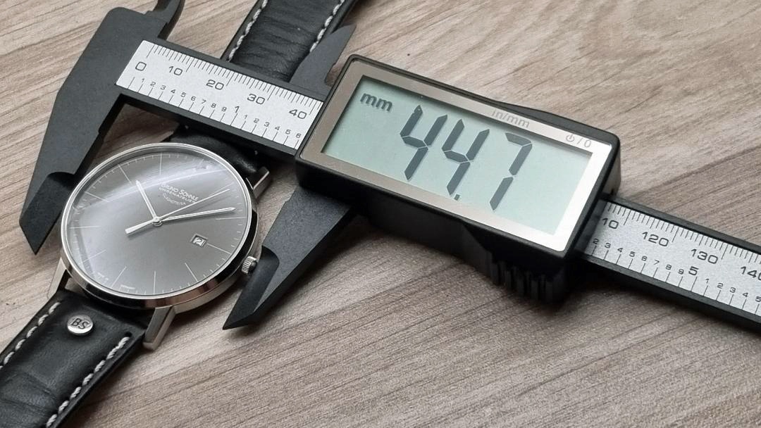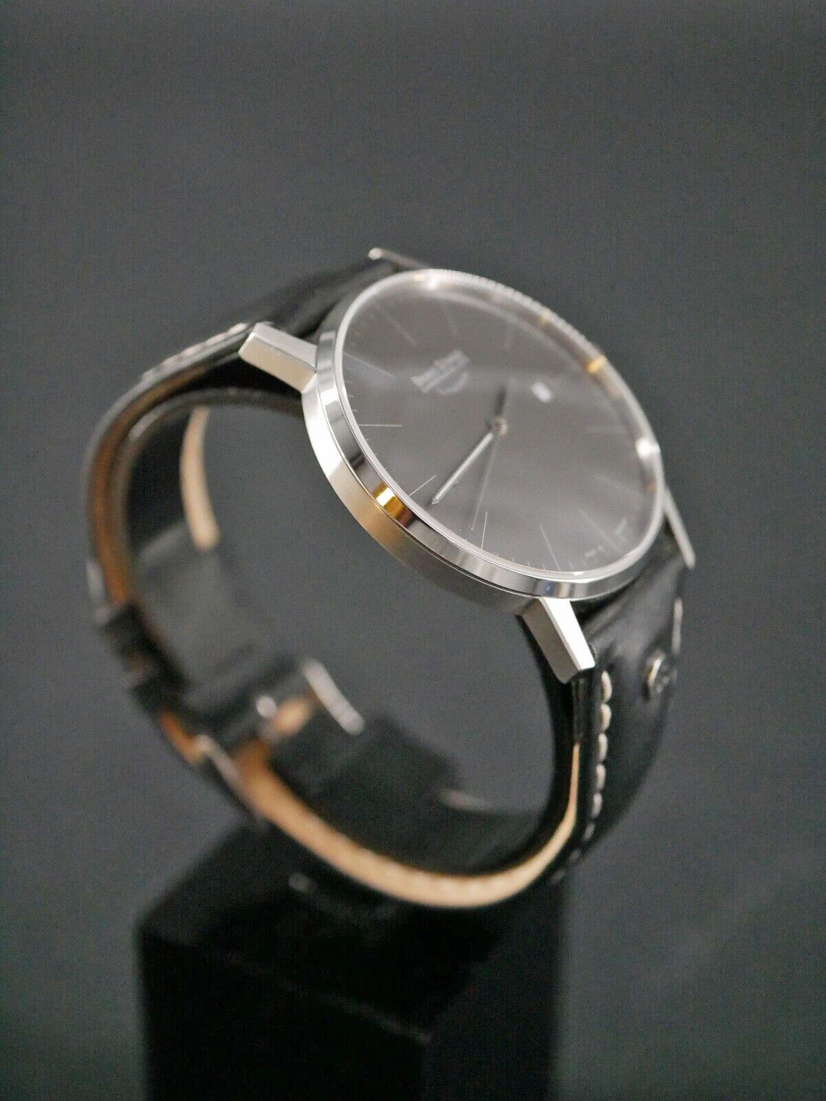 Diese ungetragene Herrenuhr ist eine eleganter Begleiter auf allen Wegen. Mit 42 mm Durchmesserrt und 7,4 mm Höhe trägt sie kaum auf. Sie ist eine klassische Dresswatch, die sehr aufgeräumt und ruhig aussieht.